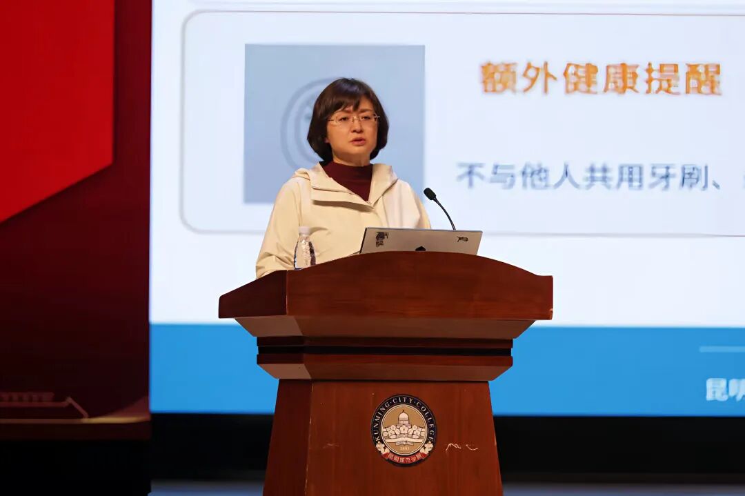 随后,昆明安琪儿妇产医院妇科副主任医师徐溧莲医生以深厚的专业功底和亲切的表达方式,围绕“两癌预防”与“艾滋病科学防护”两大核心议题展开讲解。她从宫颈癌的病因机制、HPV疫苗的接种时机、早期筛查的关键意义,到艾滋病的传播途径、预防措施及科学防护要点,层层深入,将晦涩的医学知识转化为易于理解的健康指南。徐主任强调:“早接种、早筛查是预防宫颈癌最有效的防线;科学的认知与防护,是抵御艾滋病的首要屏障。”现场师生纷纷表示受益匪浅。
